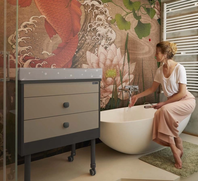 GROWI 2u1 je promišljen komad namještaja koji raste s vašim djetetom. U načinu previjanja na dohvat ruke je integrirana dječja kadica s 2 anatomska sjedišta (za 0–6 i 6–12 mjeseci), s čepom i ispustom za brzo ispuštanje vode. Po završetku razdoblja previjanja komodu lako pretvorite u udobnu dječju sofu sa stolićem i spremišnim prostorom.