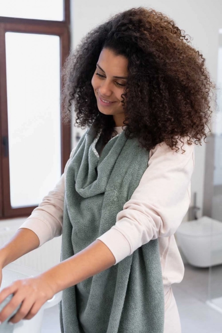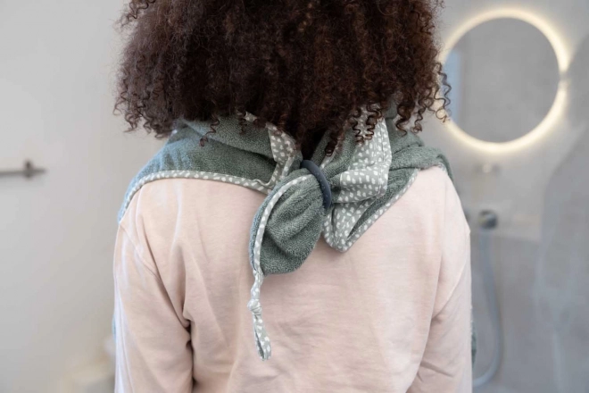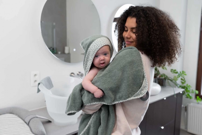 Kapuljača čuva toplinu nakon kupanja, a dimenzija 90 × 100 cm osigurava udobno zamatanje beba i veće djece.