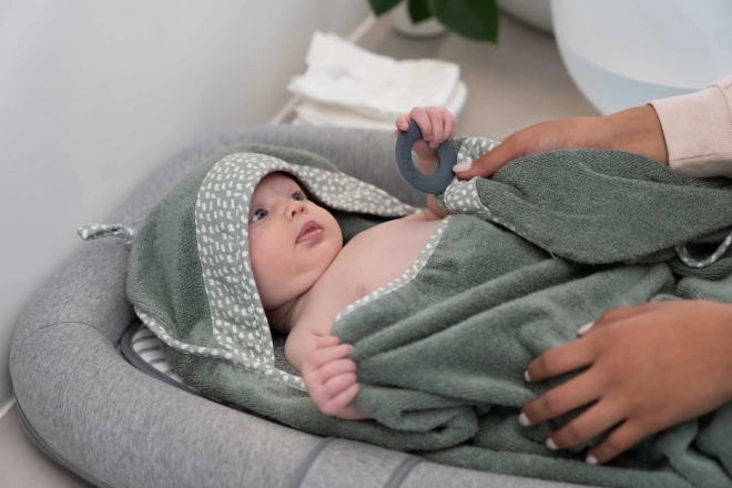 Uživajte u mirnijem kupanju s ručnikom s kapuljačom DOOMOO Dry & Play. Promišljeno pričvršćivanje pomoću silikonskog prstena omogućuje roditeljima zakopčati ručnik oko vrata, imati slobodne ruke te udobno i sigurno rukovati djetetom. Nakon kupanja dovoljno je priviti bebu uz sebe i ručnik će je odmah osušiti i ugrijati.