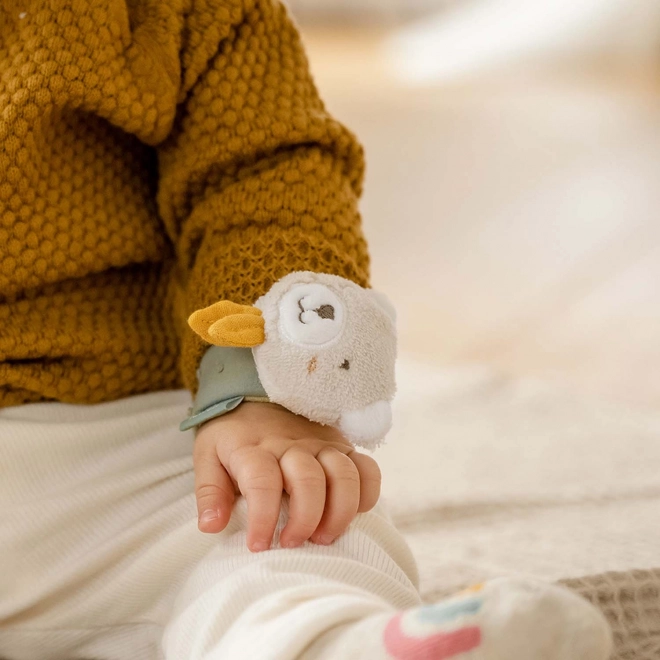 Jednostavno se stavlja na ručicu, a pri pokretu djeteta – trešnja ručicama proizvodi fascinantne zvukove koje mališani vole. Zvečka narukvica na razigran način potiče sluh, hvat i dodir bebe te finu motoriku.