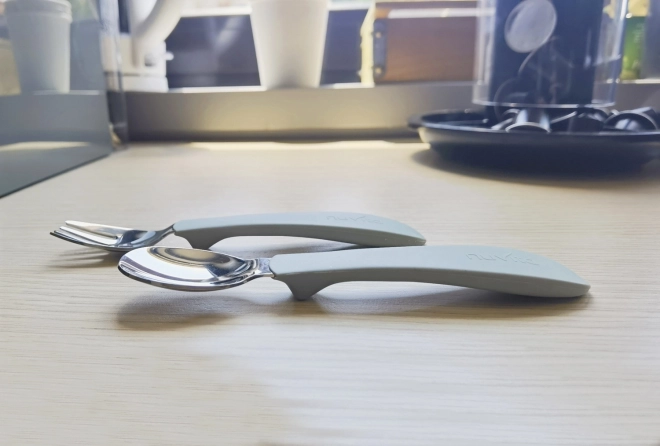 Žlička i vilica imaju higijenski “nekontaktni” držač koji sprječava izravni kontakt s površinama. Ručka pribora je ergonomska, pa će je lako držati i djeca koja tek uče jesti samostalno. Zahvaljujući silikonskoj ručki, žlička neće kliziti iz dječjih ručica.