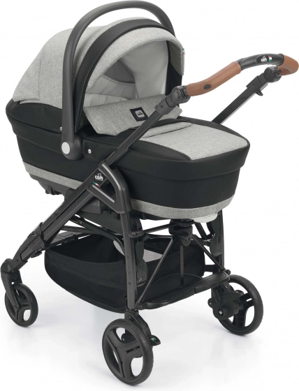 Duboka košara s teksturiranom tkaninom i detaljima od eko kože. Preklapanjem oslonca pretvara se u udobnu njihalicu, idealnu za umirivanje bebe.