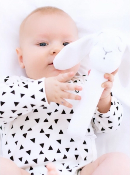 Zvečkalo zečić EFFIK idealna je prva igračka za novorođenčad i dojenčad. Mekani pliš, lagana konstrukcija i nježna zveckava ispuna umiruju, a istovremeno potiču prirodnu znatiželju djeteta. Ergonomski oblik olakšava hvatanje malim prstićima.