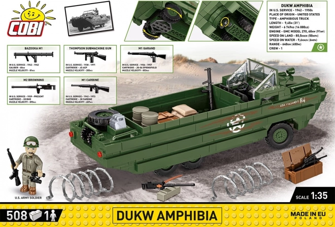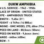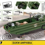 Konstruktorski set Amfibija DUKW osmišljen je za ljubitelje povijesti i vojne tehnike. Model je izrađen u mjerilu 1:35 i krasi ga službeni logo proslave 80. obljetnice savezničkog iskrcavanja u Normandiji. Donosi realistične elemente poput okretnih kotača te američkog vojnika s mnogo pribora, uključujući bazuku, Browning, Garand, Thomson i M1. U tovarnom prostoru nalaze se sanduci, bačve, kanistri i rezervni kotač.