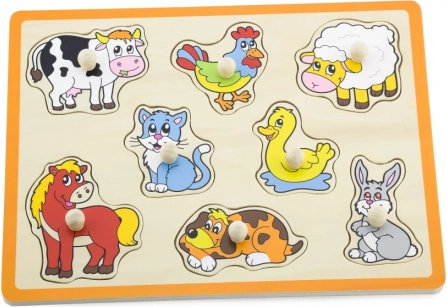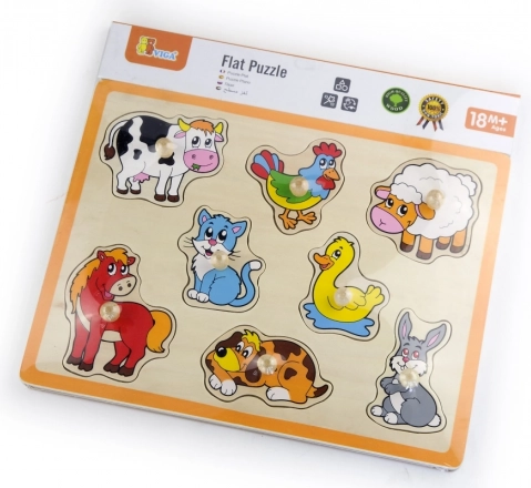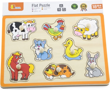 Drvene puzzle od tvrtke Viga dizajnirane su za poticanje mašte i motoričkih vještina djece. Sastoji se od ploče i 8 tematskih dijelova s čepovima za lako rukovanje. Dijelovi predstavljaju životinje i moraju biti postavljeni na ploču u odgovarajuće otvore.