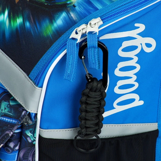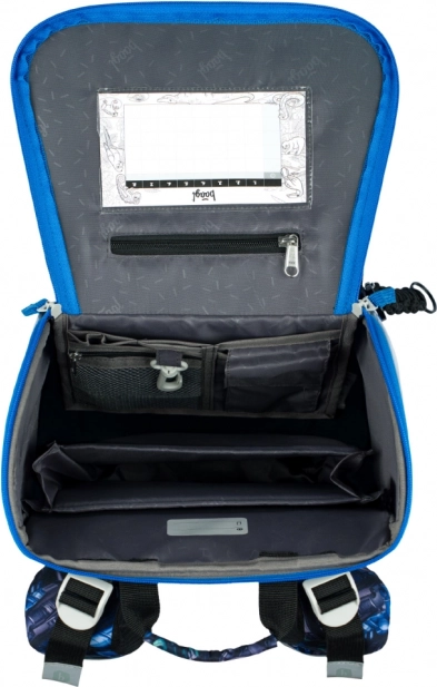 Pametno unutarnje raspoređivanje s preklopnim otvaranjem omogućuje brz pristup potrepštinama izravno iz klupe. Ne nedostaje prozirni džep za raspored sati, unutarnji organizator s elastičnom trakom za fiksiranje, izolirani prednji džep za užinu, čvrsti bočni džepovi za bocu, izdržljivo dno za stabilnost i izraženi reflektirajući elementi za sigurnost. Set nadopunjuje jednokatna pernica s YKK zatvaračem i praktična vrećica s karabinom i donjim džepom na patentni zatvarač.
