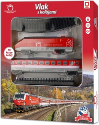Vlak set Željezničko Društvo Slovačka savršen je poklon za sve ljubitelje željeznice i male inženjere. Set uključuje lokomotivu, vagon i komplet tračnica koje se lako mogu sastaviti u kolosijek dimenzija do 147 x 121 cm, pružajući realističan i uzbudljiv osjećaj vožnje.