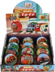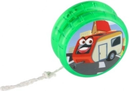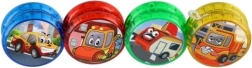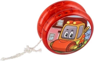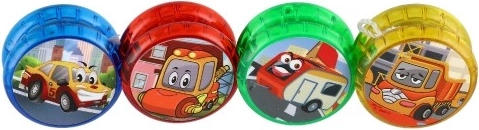 Jo-jo je dostupno u nekoliko boja, uključujući plavu, crvenu, zelenu i žutu, sve s veselim ilustracijama prometnih sredstava.