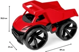 Otkrijte robusni dječji kiper MAXIMUS u intenzivno crvenoj boji, duljine 59 cm. Kombinira futuristički dizajn, laganu i izdržljivu konstrukciju te funkcionalnu preklopnu kipersku kantu s udobnom ručkom. Idealan za igru kod kuće, u vrtu i u pijesku – djeca će obožavati velike mat kotače i profinjene detalje.