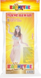 Ova stilska havajska suknja savršen je temelj za egzotičan kostim. Izrađena je od tankih plastičnih traka u prirodnoj nijansi, a u struku je ukrašena šarenim cvjetovima koji stvaraju izražajan tropski efekt. Duljina 72 cm osigurava lijep pokret pri plesu i udobno nošenje tijekom cijele priredbe.