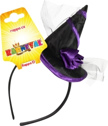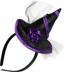 Stilska vještičja traka za kosu savršen je dodatak za zabave, karneval i Halloween. Kombinira crno‑ljubičastu izvedbu, satenski mini šeširić i tilasti cvjetni ukras za dojmljiv i fotogeničan look.