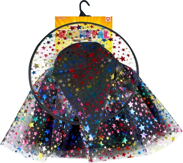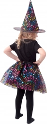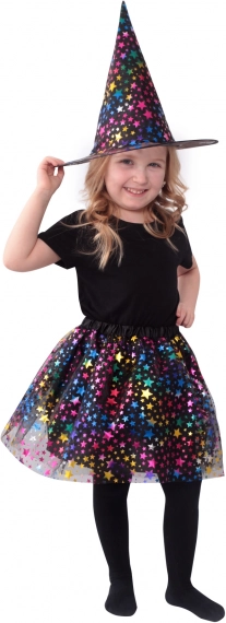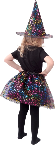 Ovaj presladak dječji kostim vještice u crnoj boji ukrašen je raznobojnim uzorkom zvjezdica koji odmah privlači pažnju. U kompletu su pahuljasta tutu suknja dužine oko 30 cm i usklađeni šiljasti šešir, zahvaljujući kojima se svako dijete u trenu pretvara u malu vješticu.