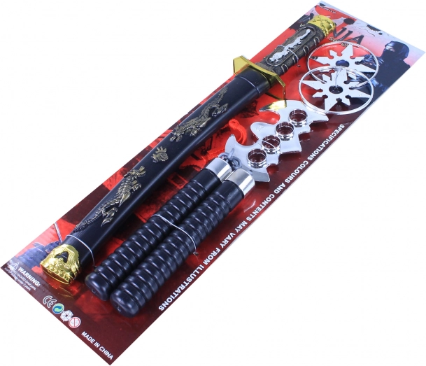 Zahvaljujući ovom ninja setu igračaka, svaki mali borac može uroniti u svijet borilačkih vještina. Set sadrži mač katanu s futrolom, ukrašen detaljnim ornamentima, i druge igračke poput bacačkih zvijezda i nunčaka za savršenu igru borca.