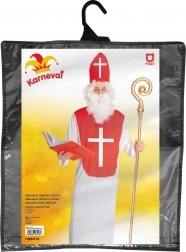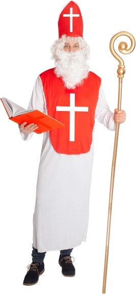Ovaj kostim svetog Nikole za odrasle sastoji se od duge bijele halje (oko 145 cm od ramena) i crvenog ovratnika s izraženim bijelim križem. U kompletu je i kapa sa zatvaranjem na čičak za brzo i sigurno učvršćivanje. Zahvaljujući univerzalnom kroju, kostim je udoban za nošenje i lako se slojevito kombinira.