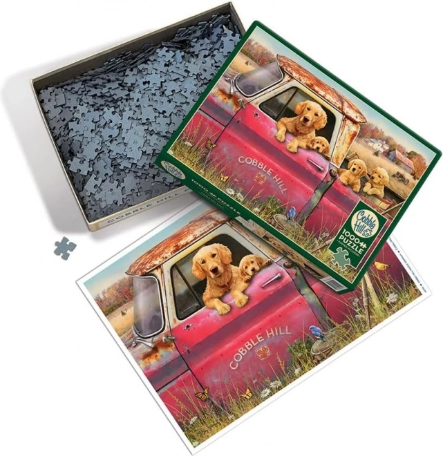 Uživajte u čarobnoj seoskoj atmosferi s detaljnom ilustracijom: zahrđali crveni kamionet, polja, cvijeće, leptiri i četiri razigrana šteneta jamče sate ugodnog opuštanja. Zahvaljujući kvalitetnoj izradi i nepravilno oblikovanim dijelovima doživjet ćete glatko slaganje i savršen rezultat.
