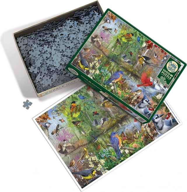 Otkrijte prirodnu ljepotu na ilustraciji punoj šarenih ptica kraj jezerca, gdje se isprepliću proljeće, ljeto, jesen i zima. Puzzle iz kolekcije COBBLE HILL koristi nepravilni izrez, pa kutovi i rubovi dijelova nisu u jednoj osi i svaki dio ima svoj karakter. Rezultat je zanimljivije slaganje i dulje vrijeme igre.