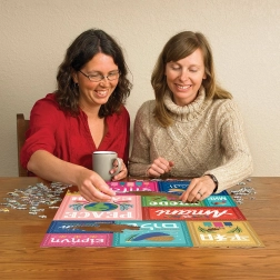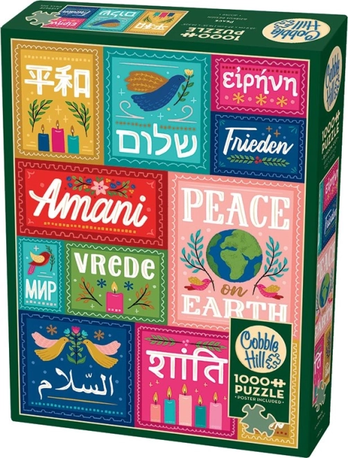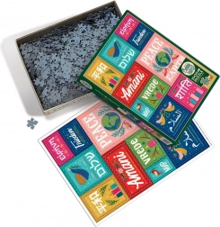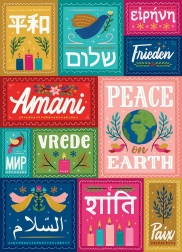 Ova dizajnerska slagalica donosi snažnu poruku – mir je univerzalan. Gornji red predstavlja japanski, hebrejski, grčki i njemački, u sredini se nalaze svahili (crvena), ruski, ukrajinski i drugi slavenski jezici koji koriste ćirilicu (tirkizna), afrikaans, nizozemski (zelena) i engleski. Donji red nadopunjuju arapski, hindski i francuski.