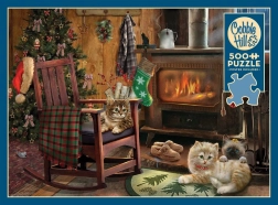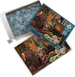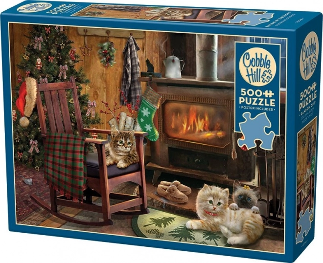 Slagalica prikazuje božićnu scenu s mačićima kraj kamina, idealnu za stvaranje blagdanske atmosfere kod kuće.