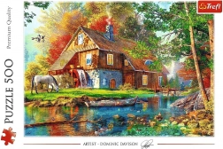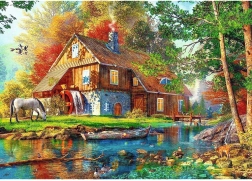 Otkrijte čar sela s puzzleom koji nakon slaganja stvara sliku dimenzija 480 × 340 mm. Ilustracija Dominica Davisona prikazuje idiličnu kućicu uz mirnu riječicu, okruženu prirodom – idealan motiv za trenutke odmora i koncentracije.
