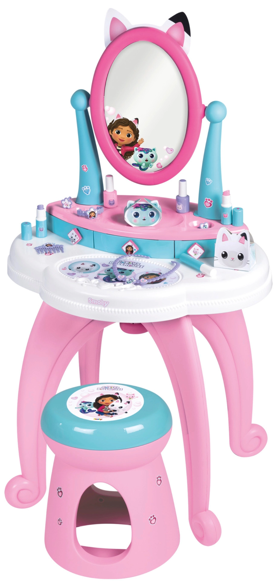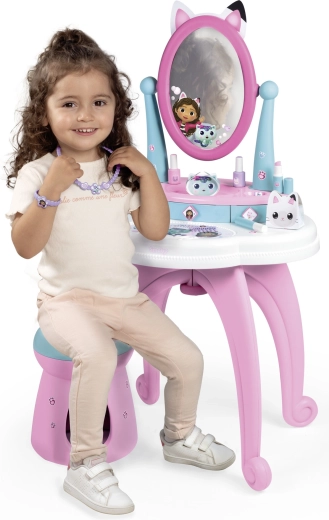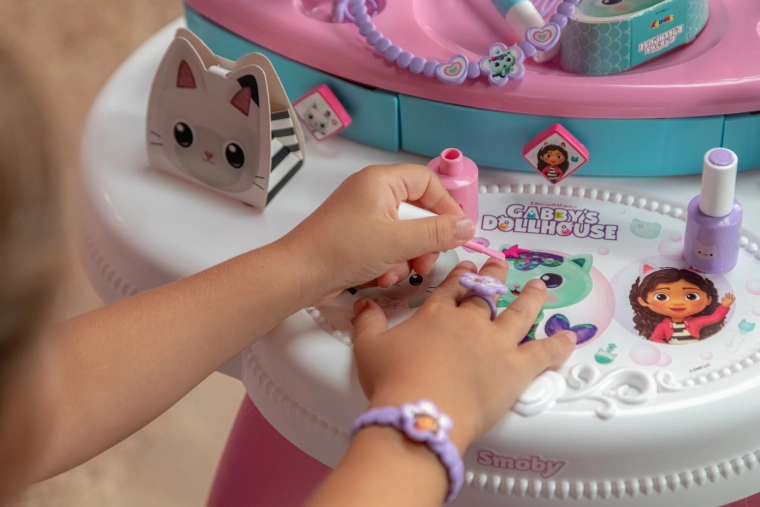 Toaletni stolić za djecu inspiriran omiljenom serijom GABBY’S DOLLHOUSE pretvara sobu u mali kozmetički studio. Zahvaljujući velikom podesivom ogledalu, trima ladicama i bogatom setu dodataka, sve je pri ruci, a igra djeluje realistično i sigurno.