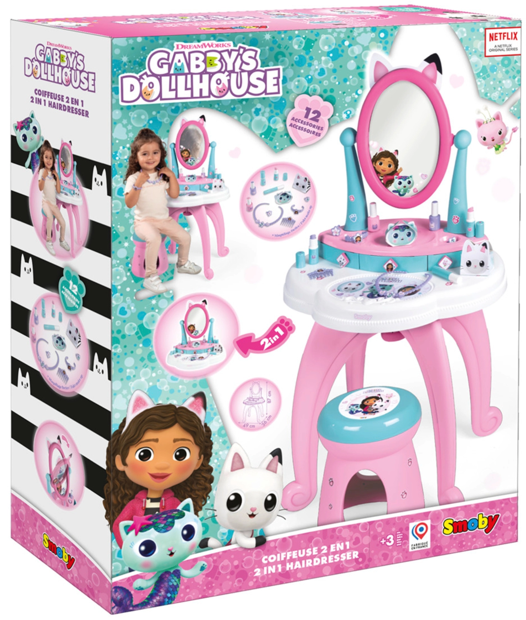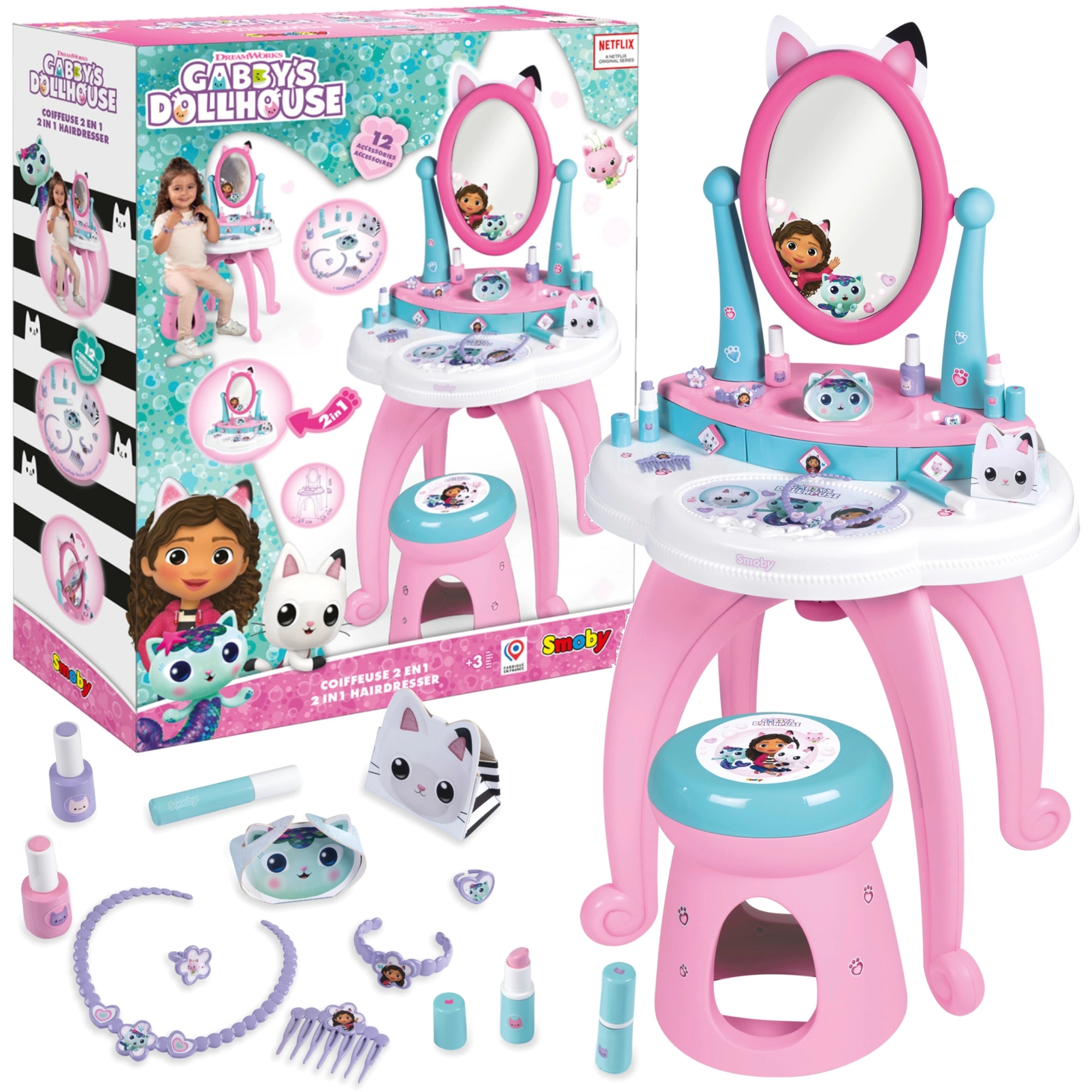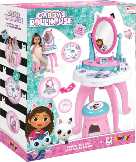 Uđite u čarobni svijet GABBY’S DOLLHOUSE s dječjim toaletnim stolićem 3 u 1 marke Smoby. Nudi feniranje, šminkanje i njegu noktiju, ima veliko podesivo ogledalo, 3 ladice i udobnu stoličicu. U pakiranju je 12 dodataka za kreativnu igru i razvoj mašte.