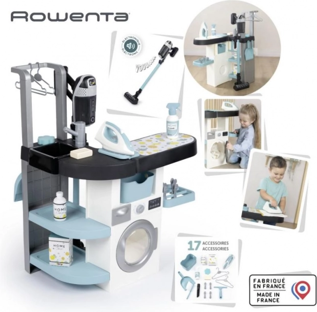 Dječja praonica s glačalom i usisavačem Rowenta savršen je izbor za male kućne pomoćnike. Sadrži četiri igraća dijela: perilicu rublja, umivaonik za ručno pranje, dio za sušenje i dasku za glačanje, koji djecu uče kućanskim obvezama.