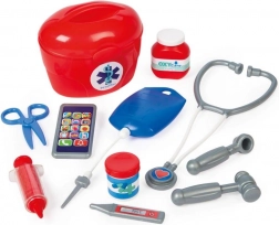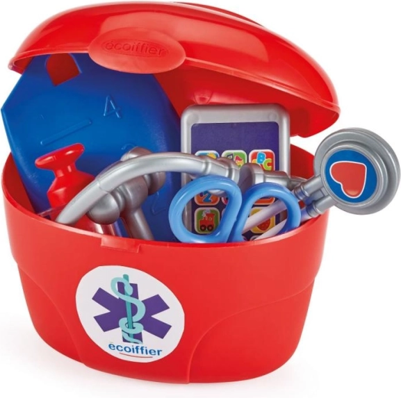 U kompletu je crveni liječnički kofer u koji djeca mogu spremiti sve alate. Sve ostaje na okupu i spremno za novu igru.