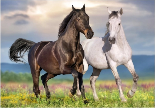 Otkrijte radost slaganja s dojmljivim motivom dvaju konja u trku. Ova slika osvaja realističnim detaljima i živim bojama, koje nakon dovršetka posebno dolaze do izražaja kao dekoracija. Zahvaljujući promišljenoj težini, slagalica je izvrsna za početnike i napredne.
