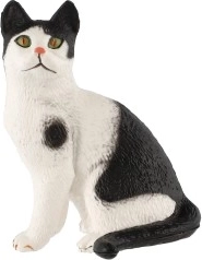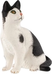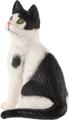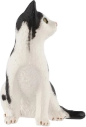 Fina tekstura krzna, precizne proporcije i crno-bijelo obojenje djeluju autentično – figurica izgleda kao živa mačka u sjedećem položaju.