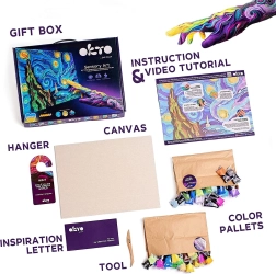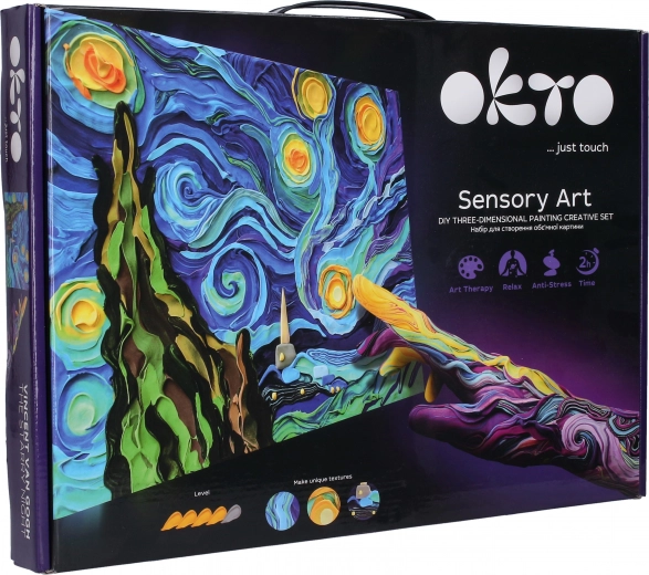 Otkrijte kreativno iskustvo s likovnim setom Okto Sensoty Art – Hvjezdna noć, nadahnut remek-djelom Vincenta van Gogha. Zahvaljujući samostvrdnjavajućoj glini (air clay) i tehnici slikanja prstima izradit ćete reljefnu sliku s razinom težine 4/5. Idealno za razvoj kreativnosti i opuštanje, s platnom dimenzija 30 × 40 cm i svime što vam treba u pakiranju.