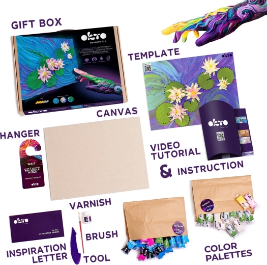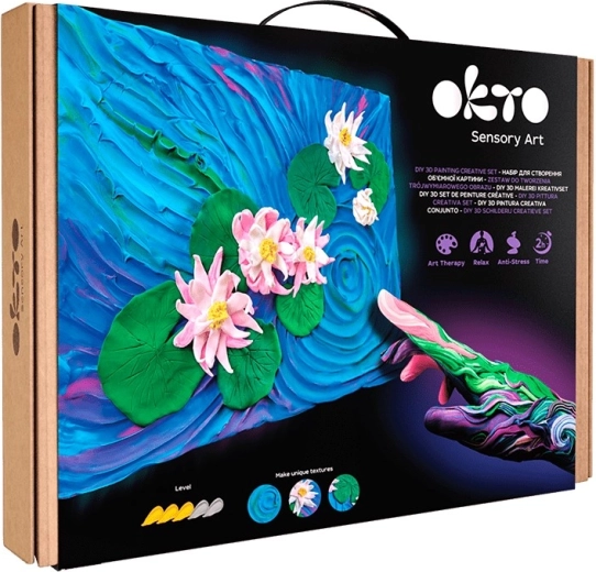 Otkrijte radost stvaranja s likovnim setom Okto „Lekniri“ u formatu 30 × 40 cm. U pakiranju se nalazi sve potrebno za vlastito umjetničko djelo: prirodno platno, modelirajuće mase, akrilatni lak na bazi vode, kist, drveni alat za oblikovanje i jasan priručnik.