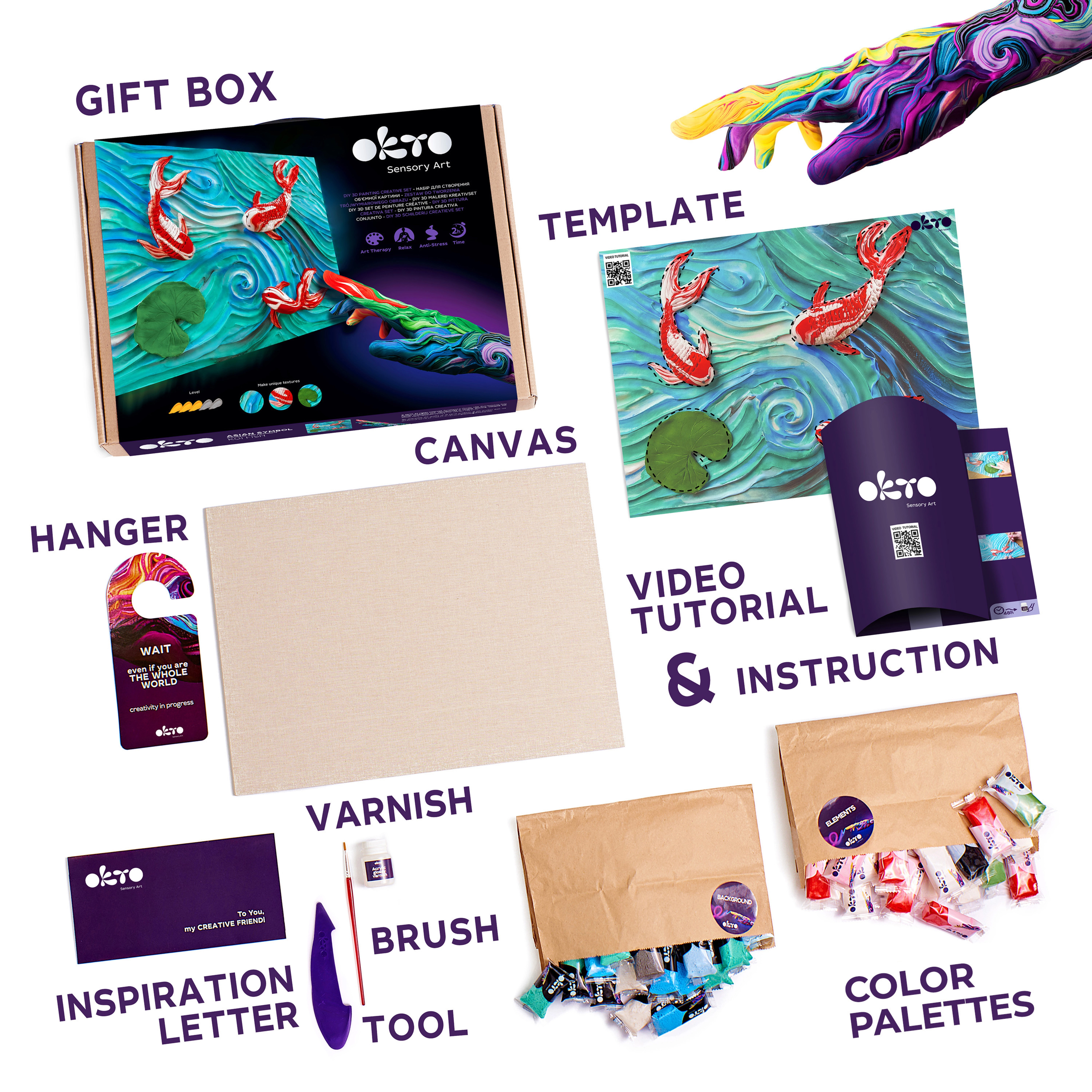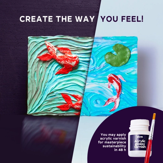 Ovaj likovni set omogućuje vam izradu dojmljive slike s motivom Koi šarani na kvalitetnom prirodnom platnu veličine 30 × 40 cm. Zahvaljujući priloženim modelirnim masama i drvenom alatku za oblikovanje lako ćete postići reljefni 3D efekt koji naglašava detalje i daje djelu jedinstven karakter.