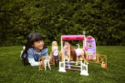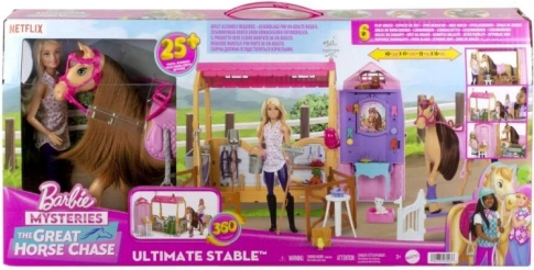 Odradite jahački dan sa setom Barbie Ultimate Stable koji nudi okruženje za igru od 360° i mnoštvo dodataka za brigu o konjima. Djeca mogu pomoći Barbie na stanici za hranjenje, u zoni njege s čišćenjem i četkanjem, trenirati skokove preko prepreka te potom ponosno izložiti vrpce na zidu s trofejima. Tu je i ružičasti „plug and play” vrt te mogućnost da se štala lako sklopi za jednostavno spremanje.