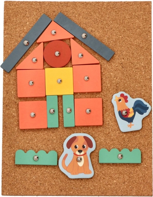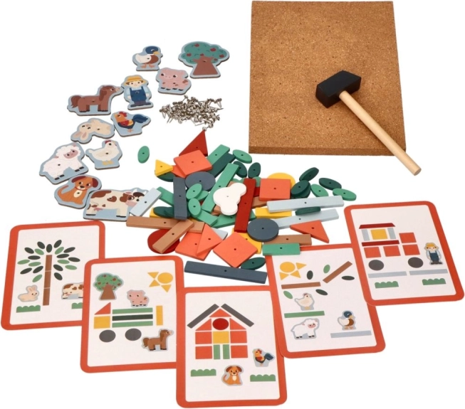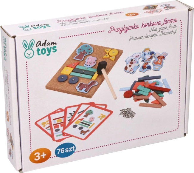 Korkova pribijanka - Pustolovine na farmi idealan je način da se djecu potakne na stvaranje vlastitih priča. Ovaj set nudi mnoštvo šarenih drvenih oblika i likova s farme koje je moguće pričvrstiti na korkovu ploču uz pomoć malih čavlića i čekića. Djeca mogu uz pomoć instruktivnih kartica slagati različite scene i tako razvijati svoje prostorne vještine.