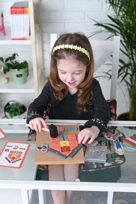 Igračke su idealne za kreativnu i edukativnu igru koja potiče djecu na osmišljavanje i pričvršćivanje oblika na korkovoj ploči.