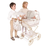 Očaravajuća kolica za lutke REBORN Verona 2024 u kombinaciji svijetlo bež i bijele s nježnim točkicama i prugicama oduševljavaju preciznom španjolskom izradom i bezvremenskim dizajnom. Zahvaljujući visinski podesivoj ručki (65–90 cm) savršeno se prilagođavaju rastu djeteta i lako se upravljaju.