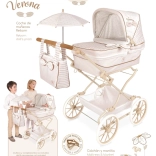 Elegantna sklopiva kolica za lutke REBORN iz kolekcije Verona 2024 u prirodnim pastelnim tonovima nude podesivu ručku 65–90 cm, lagani sklopivi okvir, prostranu košaru i bogatu opremu uključujući suncobran i stilsku torbu – idealno za veće djevojčice koje vole realističnu igru.