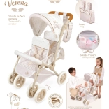 Otkrijte čaroliju kolekcije Verona u nježnim prirodnim tonovima i uzorcima. Svijetlobež i bijeli tekstil s točkicama i prugama upotpunjuju elegantni obrubi te detalji poput mašnica i vezenih pčelica. Kolica za blizance dizajnirana su za udobnu vožnju dviju lutaka istodobno te oduševljavaju preciznom izradom i španjolskim dizajnom.