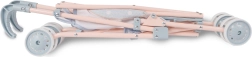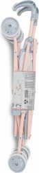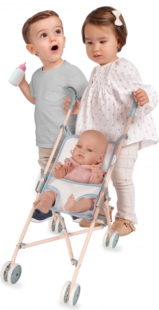 Robustan metalni okvir i izdržljiva tkanina u sivo-plavoj nijansi s pješčanim i ružičastim detaljima osiguravaju dug vijek trajanja i sigurnu upotrebu. Praktični sigurnosni sustav protiv uklještenja prstiju štiti djecu pri sklapanju. Kolica su prikladna za lutke različitih veličina, a zahvaljujući trodijelnom pojasu lutka uvijek ostaje na mjestu.