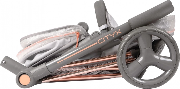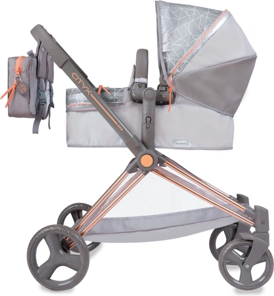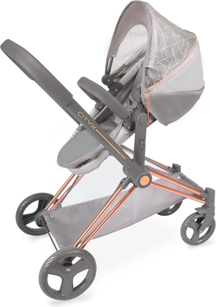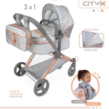 Stilska kolica za lutke 3 u 1 iz kolekcije CITY X impresioniraju modernim sivo‑bakrenim dizajnom, odvojivom košarom, podesivom kapuljačom i okretnim prednjim kotačima za lako upravljanje. Nude sklopivu konstrukciju, trodijelni sigurnosni pojas, praktičan spremnik/koš i ruksak s prozirnim džepom – idealno za djecu od 3 godine.
