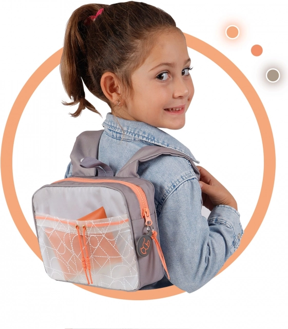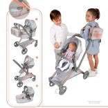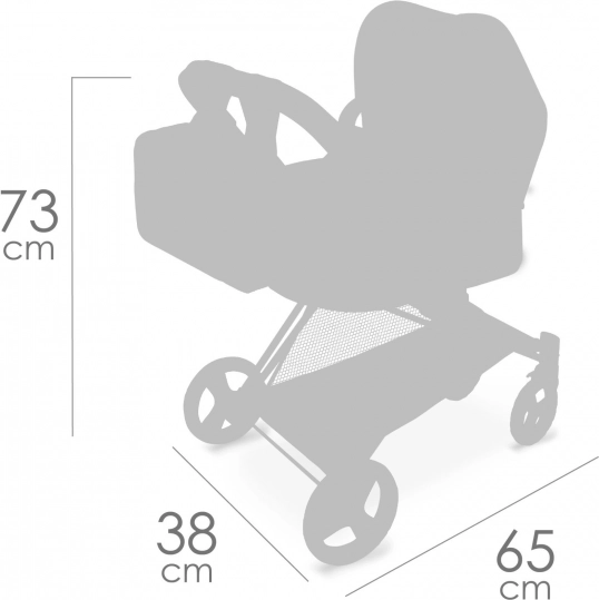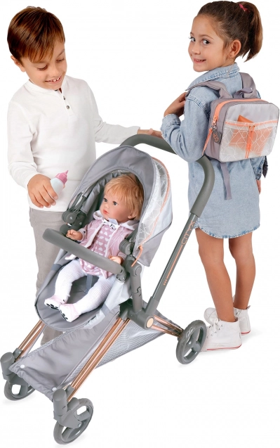 Praktična sklopiva konstrukcija štedi prostor kod kuće i u automobilu. Okretni prednji kotači olakšavaju manevriranje, trodijelni pojas sigurno drži lutku, a donja košara pruža dodatni prostor za spremanje. U kompletu je moderan ruksak s prozirnim džepom za sitnice i navlaka za košaru s patentnim zatvaračem.