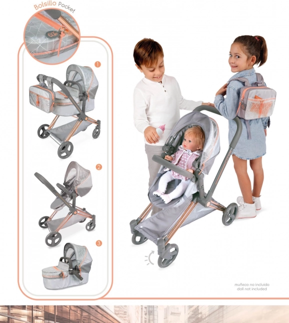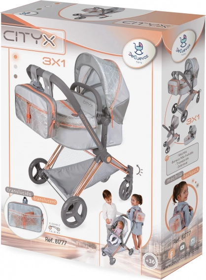 Igrališna kolica za lutke 3 u 1 iz kolekcije CITY X vjerno oponašaju moderna dječja kolica. Kombiniraju kvalitetne tkanine s prozirnim PVC‑om s efektom “stakla” i elegantnim bakrenim detaljima. Zahvaljujući odvojivoj košari, koju je moguće postaviti u ili suprotno od smjera vožnje, te mogućnosti pretvorbe u sportsko sjedište, djeca će uživati u realističnoj i udobnoj igri.