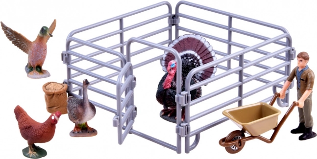 Otkrijte čaroliju sela uz set detaljno izrađenih figurica i ogradu. U kompletu se nalaze puran, pijetao, guska, patka i farmer s kolicima. Figurice su od izdržljive plastike i ručno kolorirane za realistične detalje, idealne za kreativnu igru i učenje o životu na farmi.