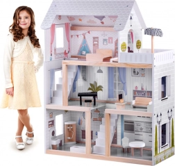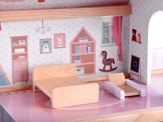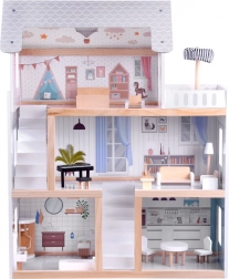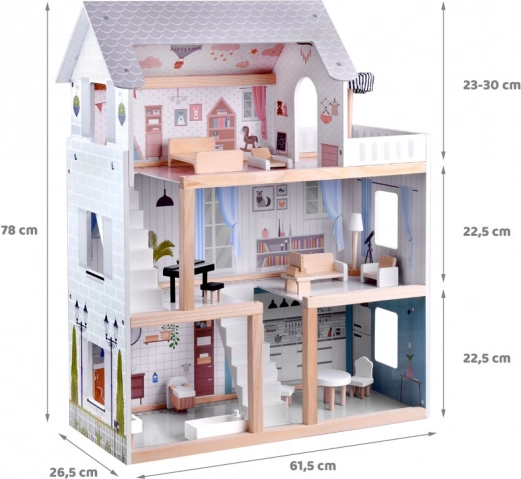 Ova drvena kućica za lutke osmišljena je kako bi djecu inspirirala na stvaralačku igru i pričanje priča. Nudi prizemlje s kuhinjom i kupaonicom, prvi kat s dnevnim boravkom i čitaonicom s kutkom za ljubitelje glazbe te potkrovlje s ljupkom dječjom sobicom i velikom terasom. Nježna boho estetika, ilustracije i drveni elementi djeluju umirujuće.