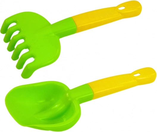 Set sadrži dječju lopaticu i grabljice s zaobljenim rubovima, idealne za male ruke i sigurne za djecu.