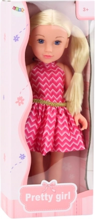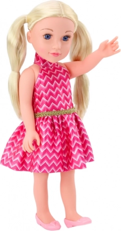 Ova prekrasna lutka ima dugu, plavu kosu oblikovanu u repiće, što joj daje dječji šarm. Kosa je mekana i lako se stilizira, što omogućuje kreativne frizerske igre. Lutka ima nježan make-up i duge trepavice koje naglašavaju njezine izražajne crte lica. Odjevena je u ružičastu haljinu sa zlatnim remenom, potpuno usklađenu s ružičastim cipelama.