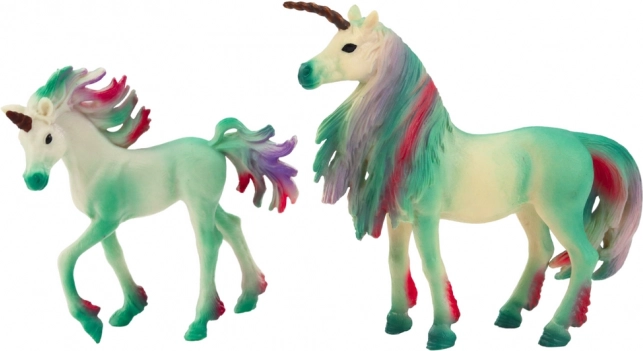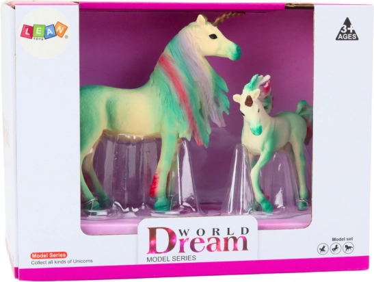 Očaravajući set od 2 figurice jednoroga – odrasli i mladunče – u elegantnoj zelenoj boji razveselit će svakog malog i velikog ljubitelja bajkovitih stvorenja. Detaljna izrada, realistične teksture i šarena griva i rep daju figuricama poseban čar. Prikladne za igru i kao dekoracija dječje sobe, izrađene od izdržljivog materijala, s certifikatom CE i normom EN71.