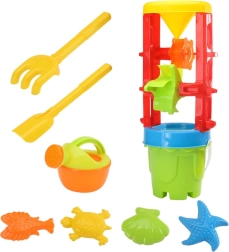 - Veliki mlin za pijesak, kanta, lopatica, grabilice, kantica za zalijevanje, 4 kalupa