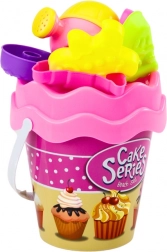 Ružičasta kantica s motivom slastica ima na poklopcu praktično sito koje pomaže odvojiti vodu od pijeska i stvoriti stabilne građevine i oblike.