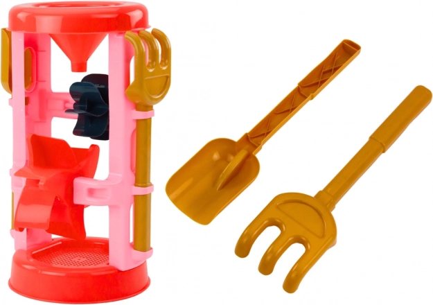 Otkrijte kompletan set za pijesak s upečatljivim ružičastim mlincem koji će svaki pješčanik pretvoriti u kreativnu radionicu. Djeca mogu prosijavati pijesak kroz sito, sipati ga kroz lijevak i promatrati kako se okreću šareni kotačići. Priloženi kalupi za dvorce, kanta, lopatica i grabljice potiču maštovitu gradnju i beskrajnu igru.